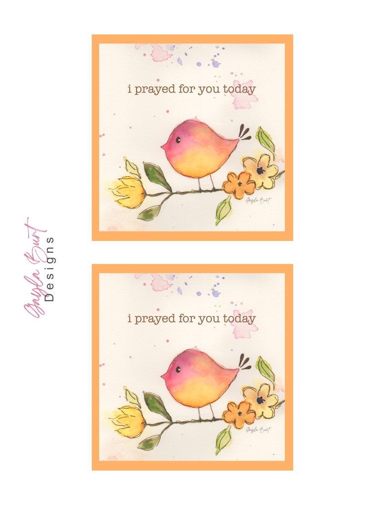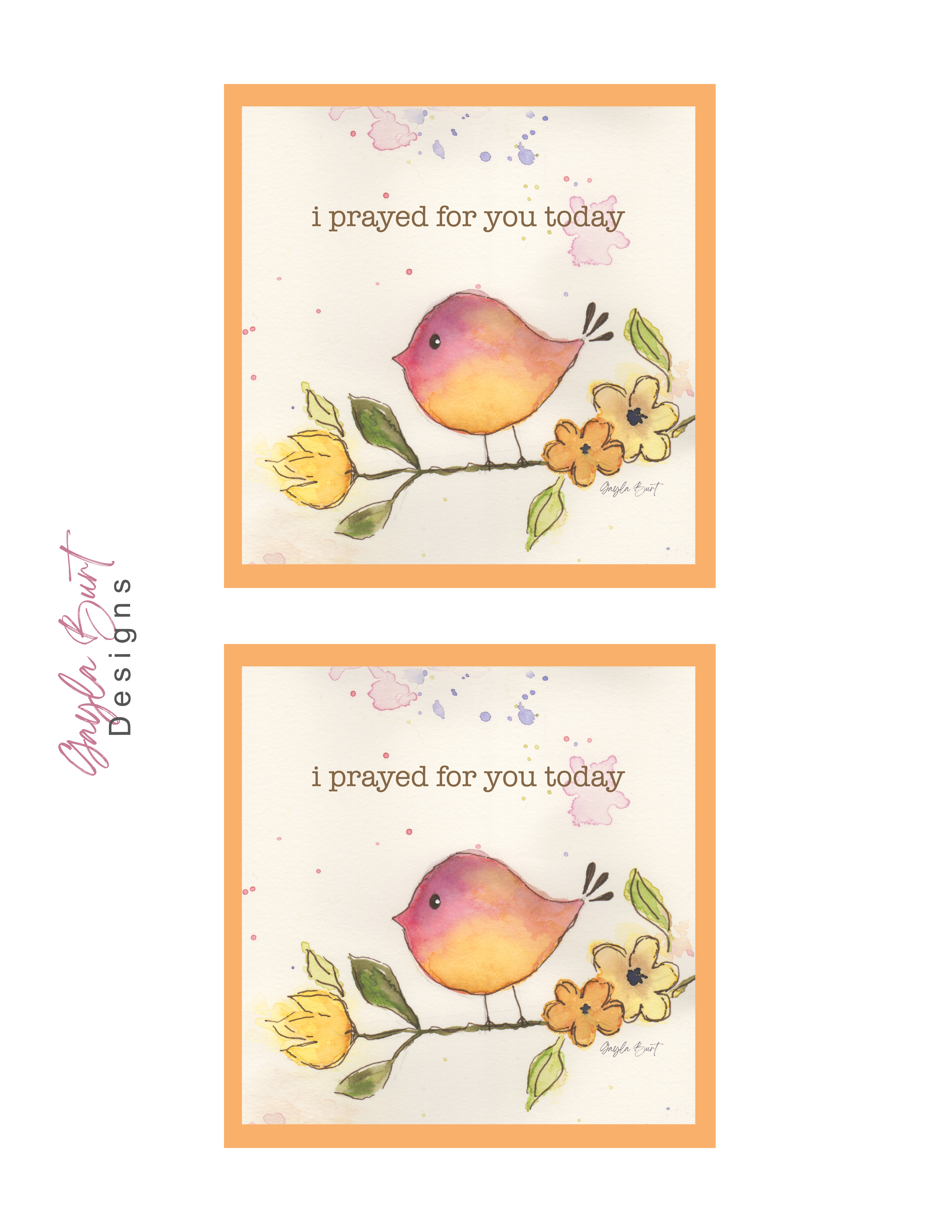 These cute little cards can be downloaded as a pdf file. 8.5 x 11. 2 cards per page. Just perfect to insert in your child’s lunch bag, place on a coworker’s desk, or send by mail as a reminder of your thoughts and prayers.