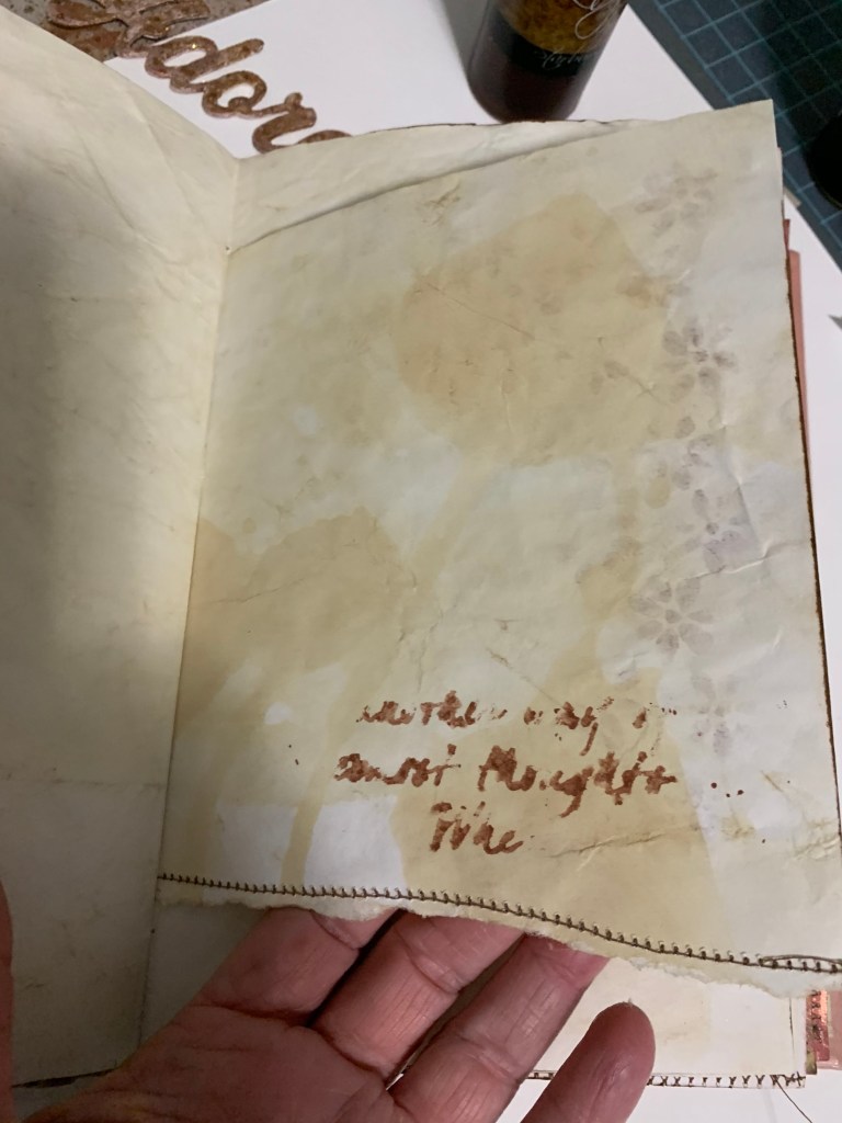 This is the middle of one section of the journal. You see the stained pages and the are where I sew in the pages. In “junk journal” terminology, this is called the “signature”.